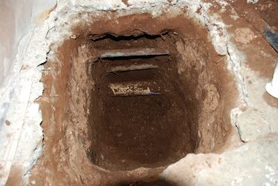 I asked them if it was OK to take pictures of them, and they said, "Sure." (They were used to having pictures taken of the work site because of insurance claims.) I told them that my family and friends back in Massachusetts would never believe that I had to have a hole dug right inside my apartment, in my dining area. I needed pix to prove that I wasn't making it up.